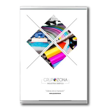 • en sus lados cortos, el póster es sujetado por dos perfiles de sujeción de aluminio para pósteres y alisado