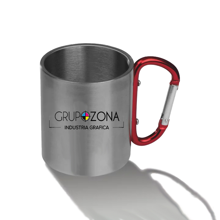 • tazas de doble pared en acero inoxidable con mosquetones a color como asa y capacidad de 200 ml