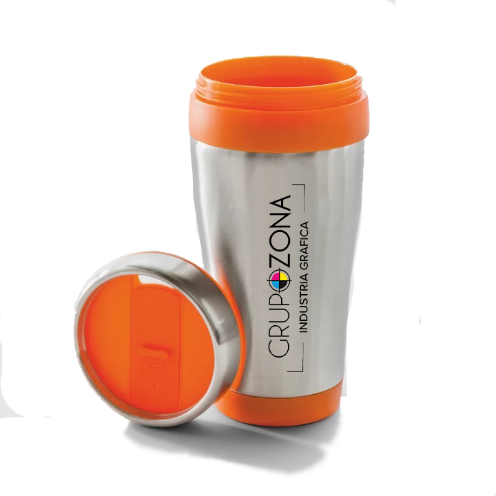 • vasos térmicos aislados con doble pared, con tapa roscada y orificio para beber deslizable